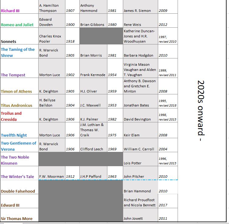 Arden also publishes a range of texts to help students approach the Bard, as well as an impressive line of other early modern plays, and a complete works (which, of course, lacks much of the detailed notes of the individual editions). And, yes, a Fourth Series has been commissioned. The general editors have been announced, and they are now choosing individual volume editors, commencing release c. 2030.